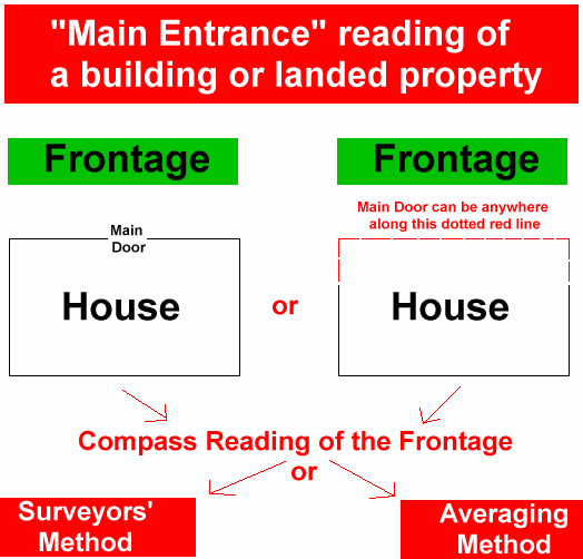 • Interior Feng Shui Qi of the House, you should take the facing of the house from the center of the house to the Main Door or the Living Room Frontage. All depends on the design of the House. Frankly, it is better to use the Main Door as the facing of thr Frontage may give a different direction (like the living room face East, but the main door falls in the North-East of the House).